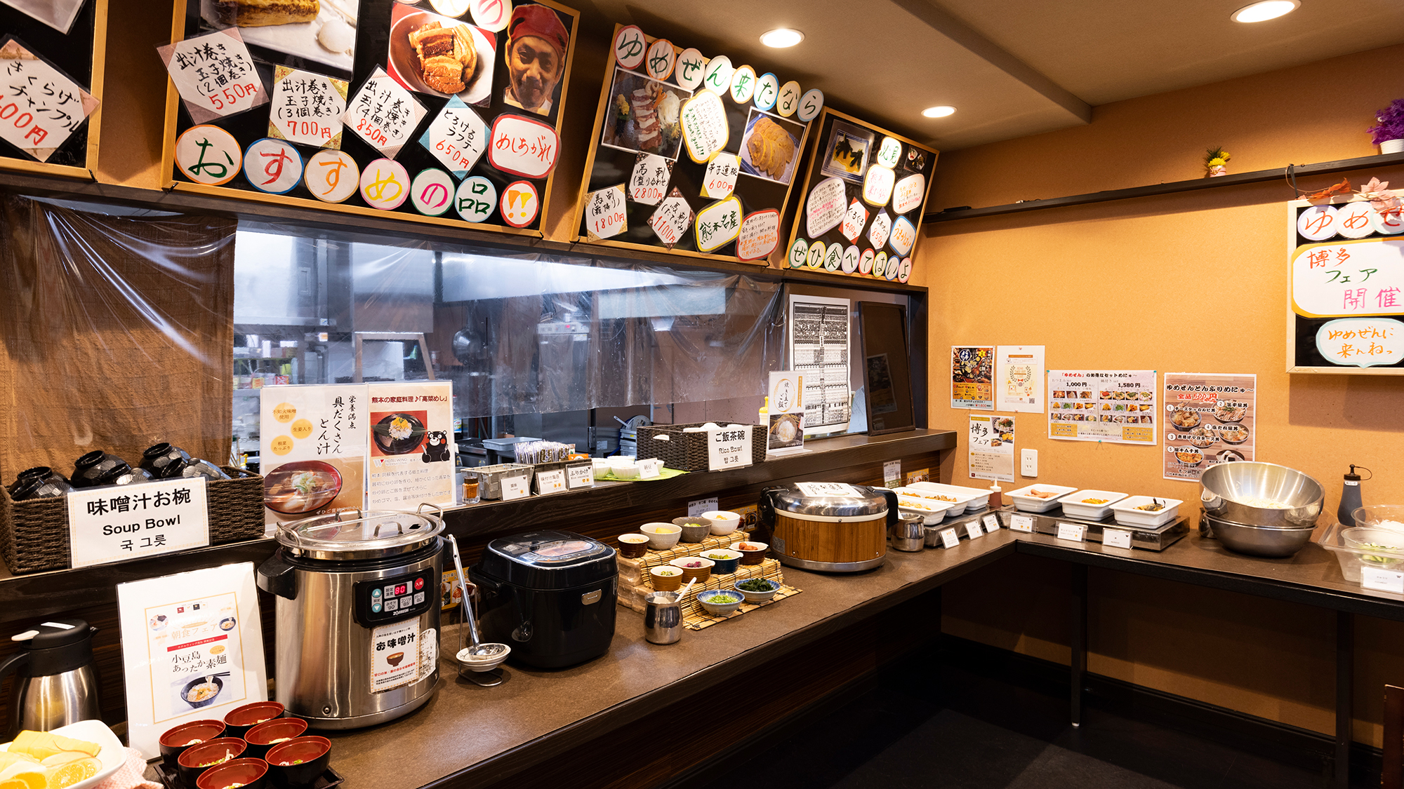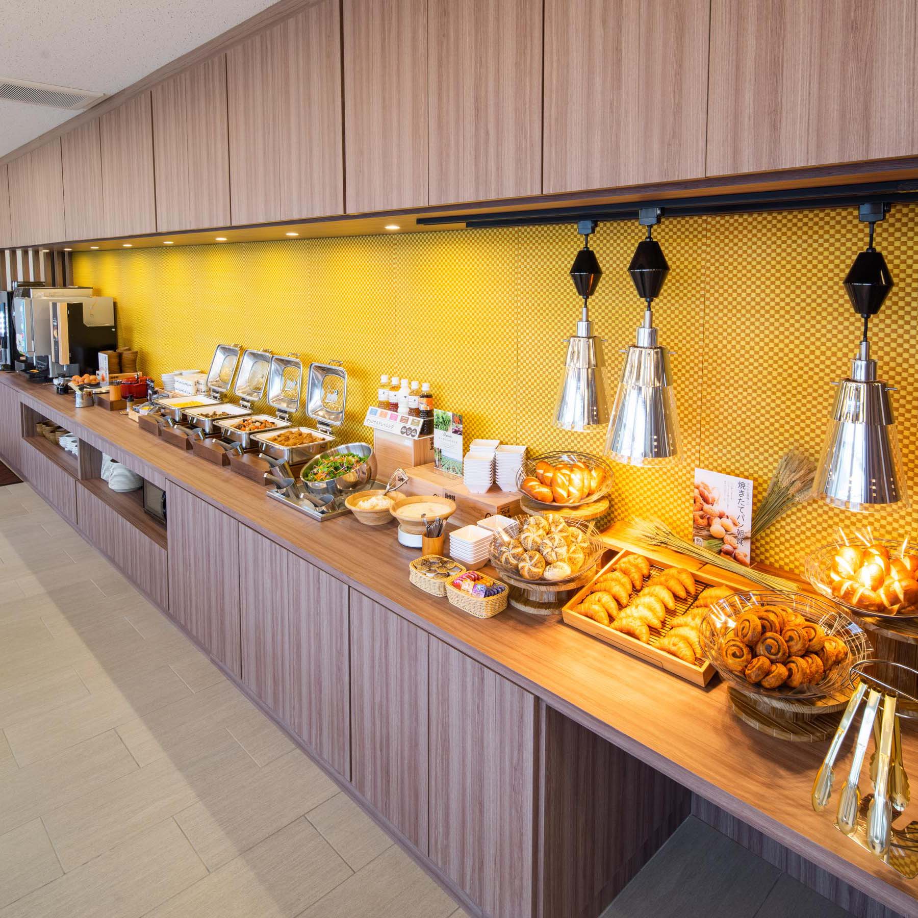 妙見の湯 スーパーホテル熊本・八代の朝食はビュッフェ形式で焼きたてのパン、特別栽培米や有機にこだわったものを積極的に取り入れた朝食です。